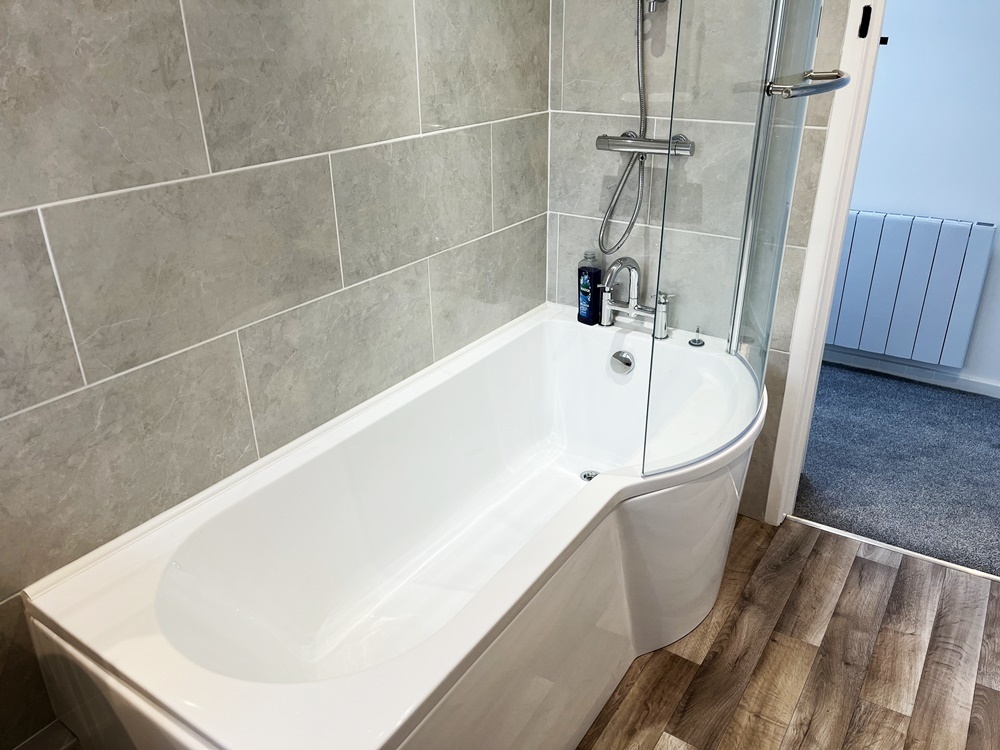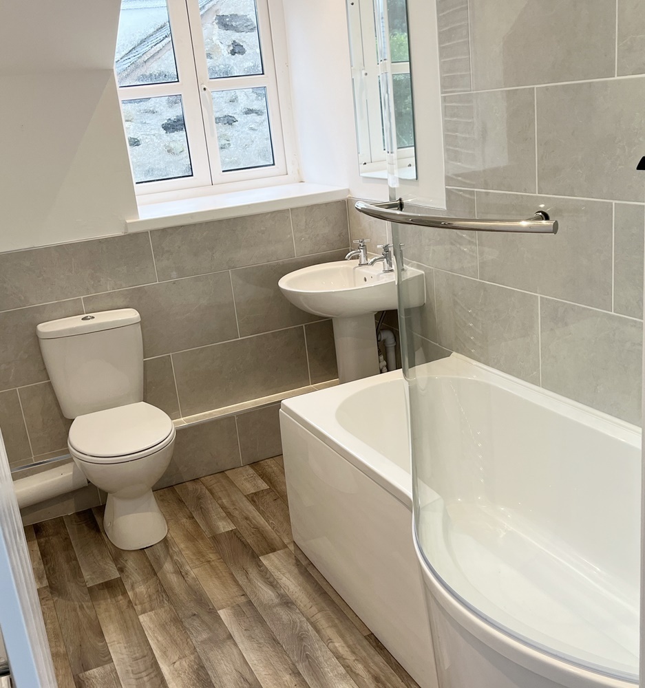 Bathroom with shower over bath, WC & Hand Basin