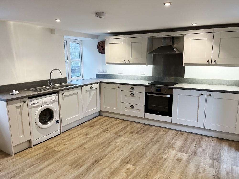Kitchen with a range of modern fitted units which includes Oven, Hob, Extractor, Integrated dishwasher, fridge & freezer. Space and plumbing for a washing machine