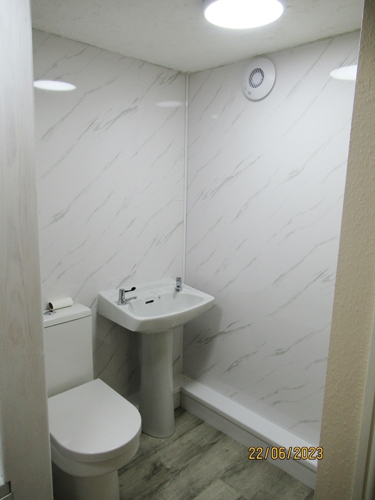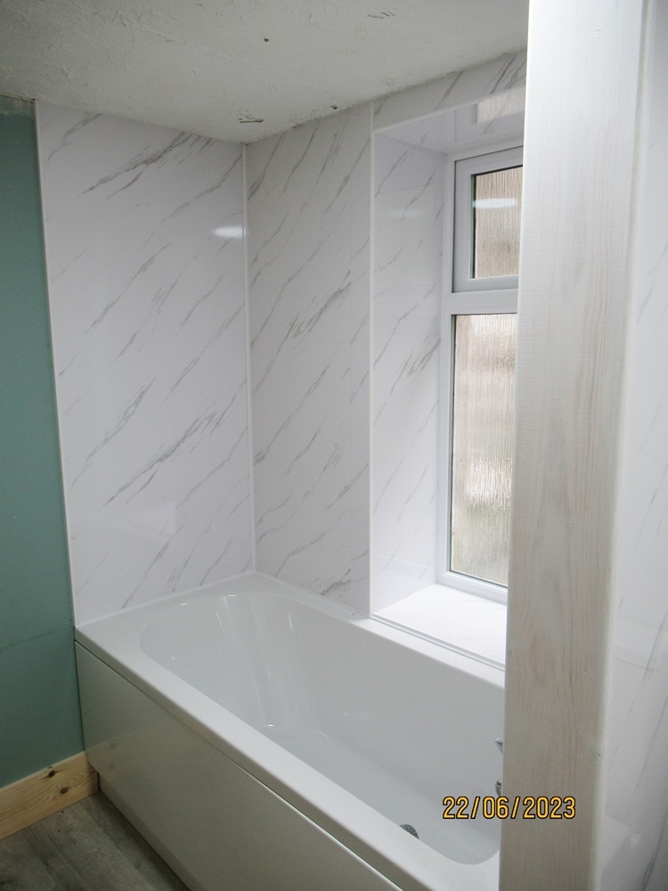 Newly fitted Family Bathroom with bath and shower over, WC and hand basin, fully fitted with aqua wall