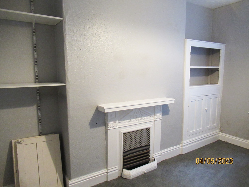Bedroom 1 with double glazed bay window to front elevation, carpeted, central heating radiator, feature fireplace (display only)