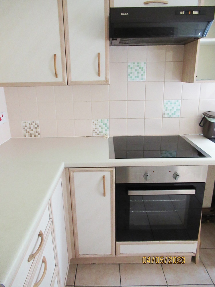 Kitchen with a range of fitted units oven and fridge freezer, vinyl flooring
